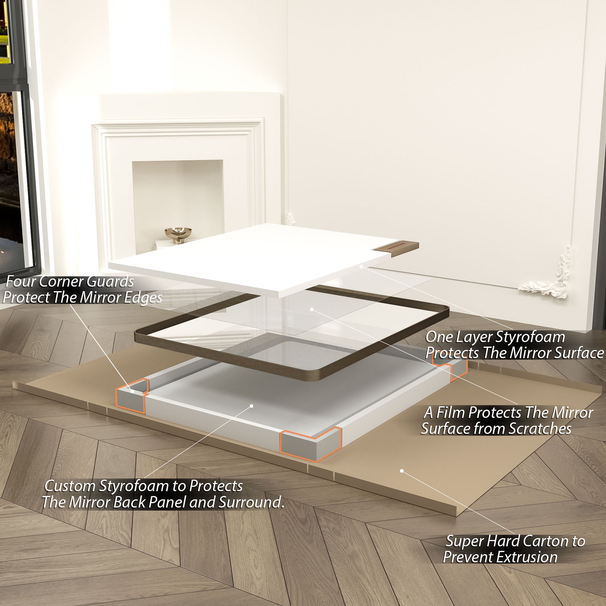 • Professional Packaging: Each mirror is made to a secret standard and secured with customized thick foam and sturdy corner guards in a carton box. Before delivered, it passed all rigorous tests including dropping, impact test, etc. Only for you to provide the perfect mirror.